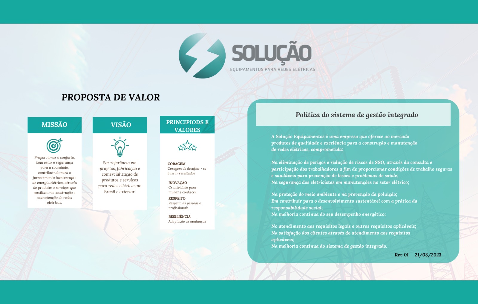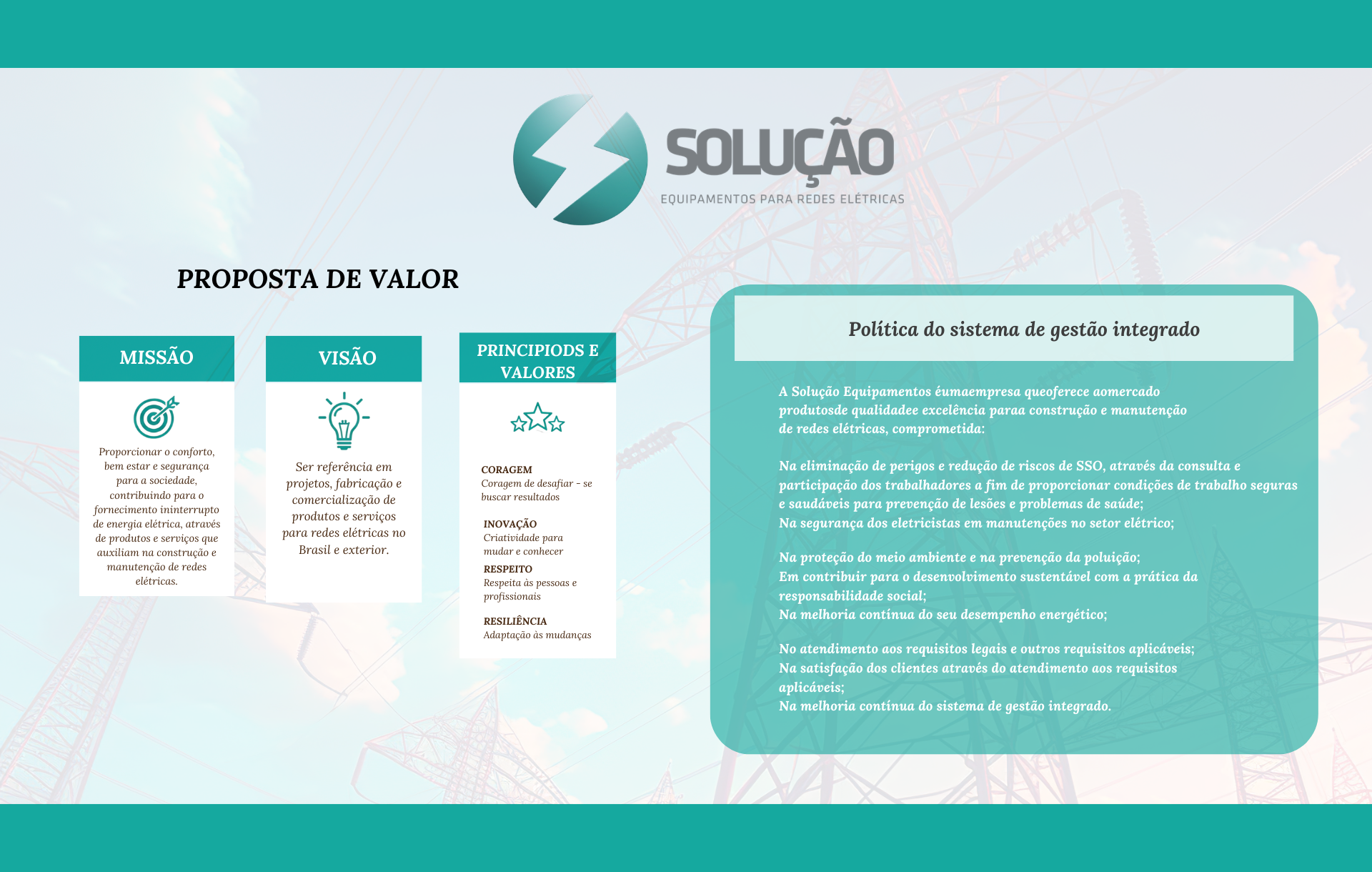 A Solução Equipamentos iniciou suas atividades há mais de 20 anos com o objetivo de atender o Setor Elétrico, inicialmente, como distribuidora de ferramentas para construção e manutenção de redes elétricas. Estruturou suas atividades ao longo de alguns anos, desenvolvendo processos de manufatura que a transformaram numa indústria.